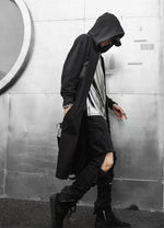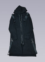 Crafted with sci-fi and cyberpunk streetwear in mind, this oversized hooded cloak is designed to make a statement. The long black straps attached by buckles at the shoulders, back, and front pockets give this techwear jacket a textured, scale-like appearance. The airy feel of this cloak will allow you to move quickly and discreetly, all while keeping you protected from the elements during mid-season weather jolts.
