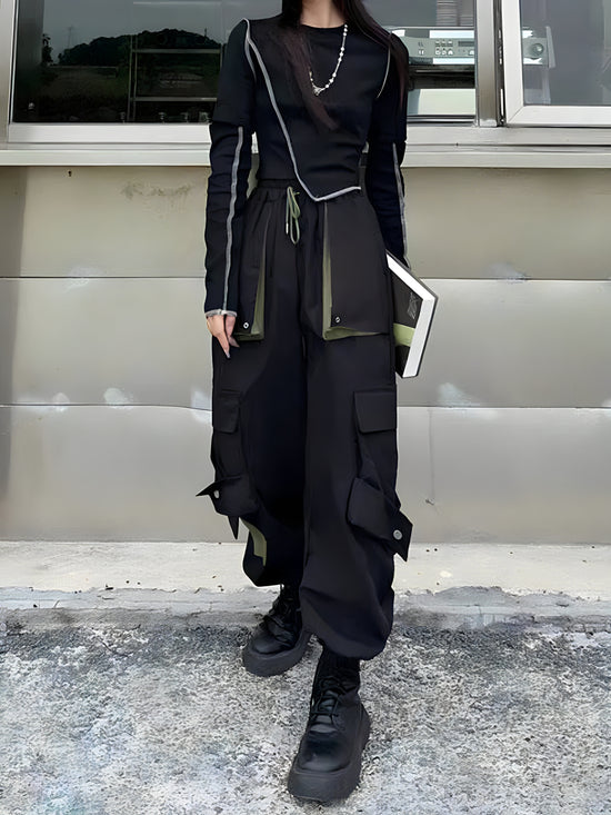 These wide-legged cargo pants exude an unapologetic charisma, a blend of Harajuku streetwear and pragmatic army attire. The black patchwork pants punctuated by sporadic green patches inject an electrifying sophistication into the daring black ensemble. The oversized, baggy fit is emblematic of nonchalance and chic, forming the crux of urban outfits.