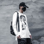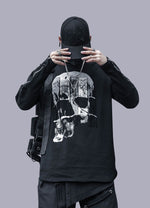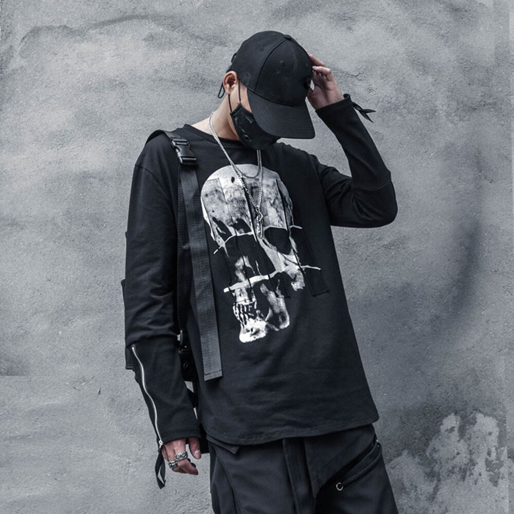 Crafted from the imaginative furnace of gothic, punk, techwear, and Japanese streetwear influences, this skull shirt harmonizes boundary-pushing aesthetics with practical design. The silhouette is intentionally oversized, evoking a sense of formidable presence, like a protector guarding the city streets at dusk.