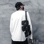 The long sleeves of this piece culminate in zippers, an homage to the utilitarian roots of techwear. Adding a layer of complexity, drawstrings dangle from the sleeves, a nod to the rawness of punk fashion. These elements, far from mere decoration, add a depth of sophistication to this round-neck t-shirt, making it a versatile piece in any wardrobe.